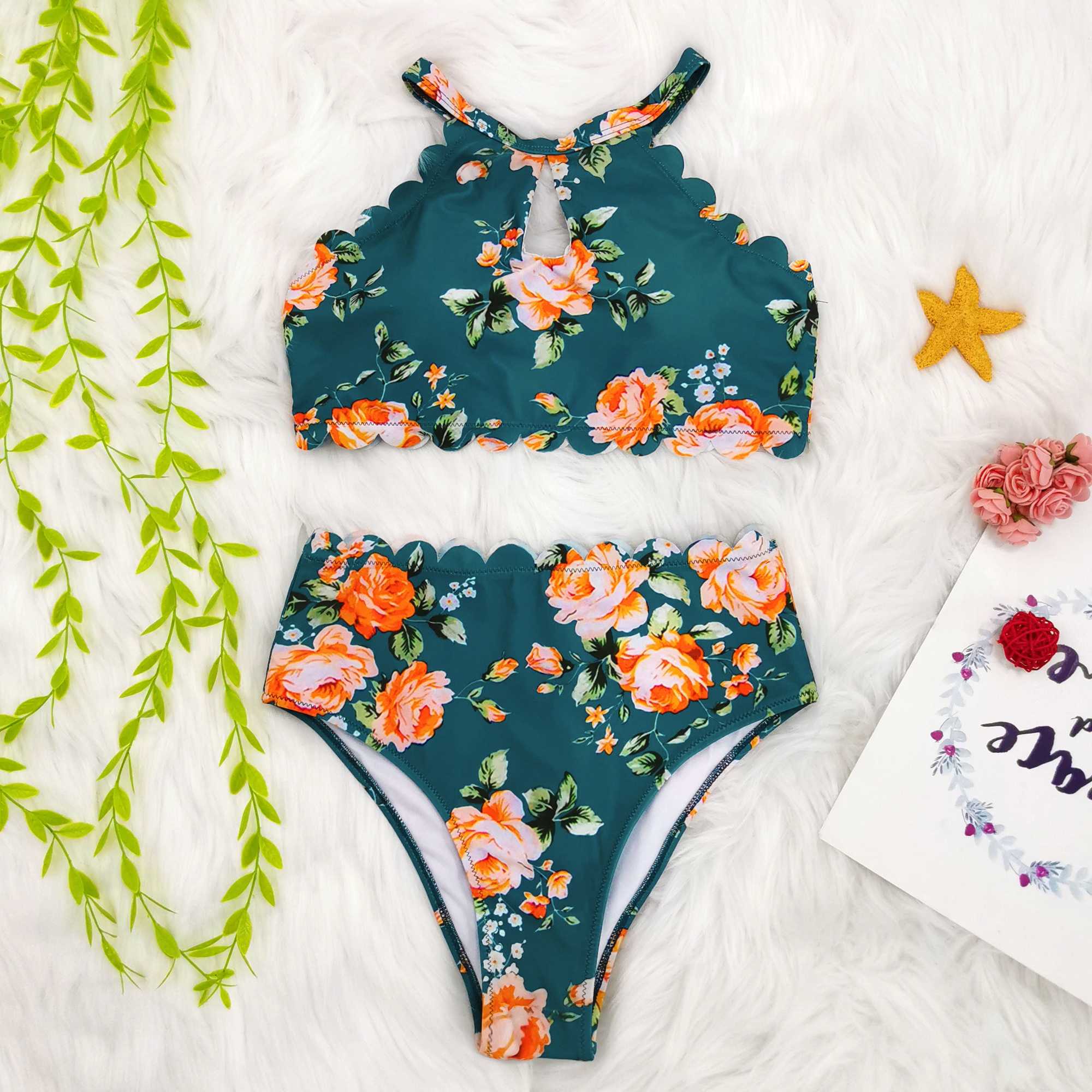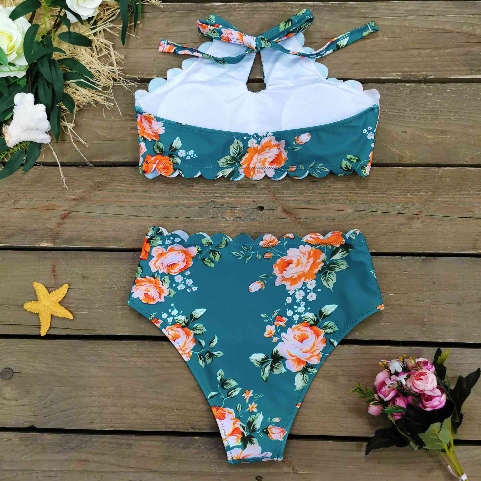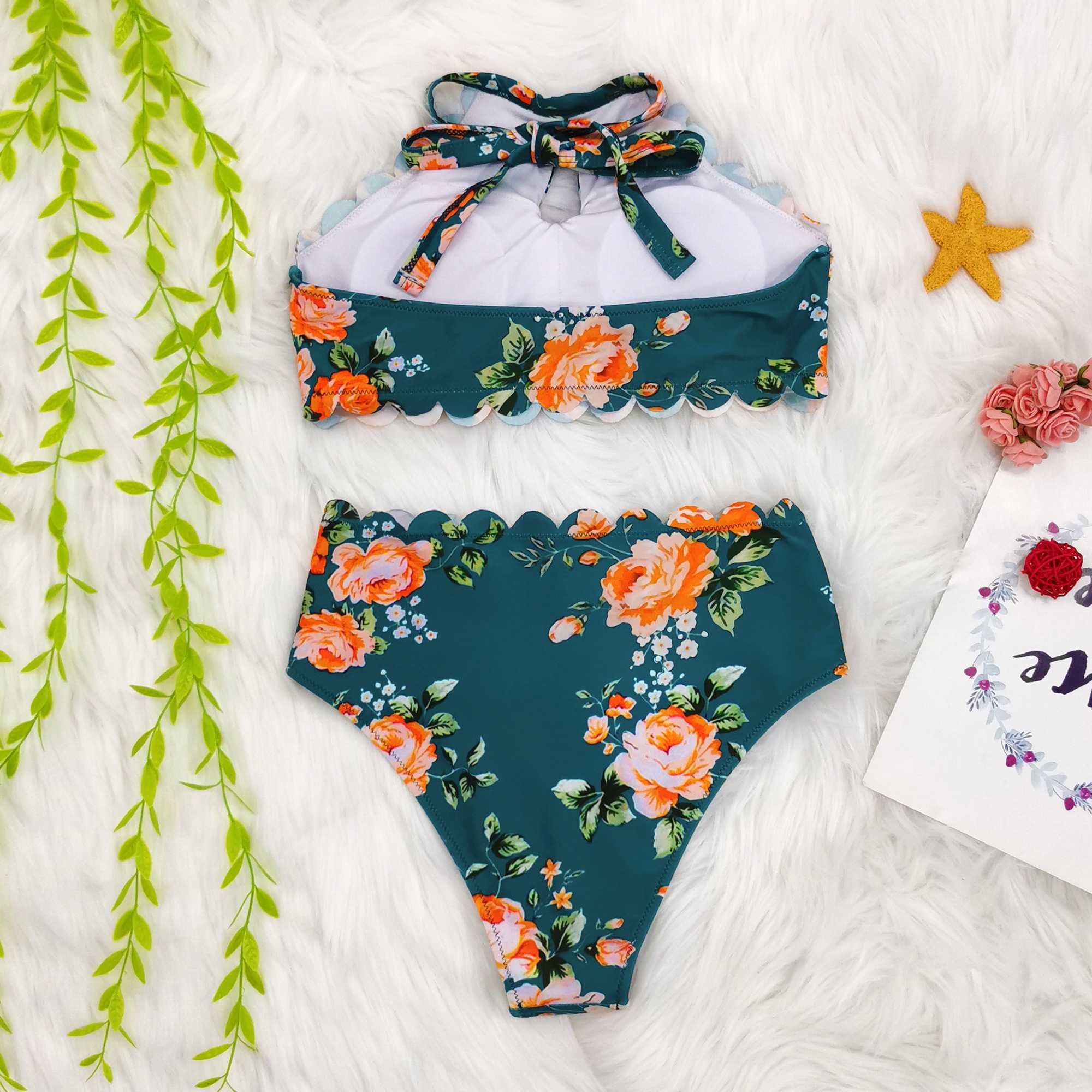 Halter-Neck Floral Falbala Bikini Swimsuit