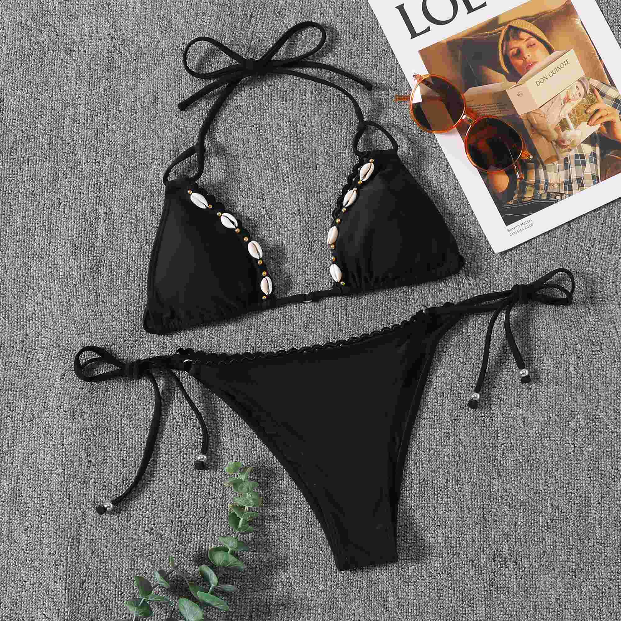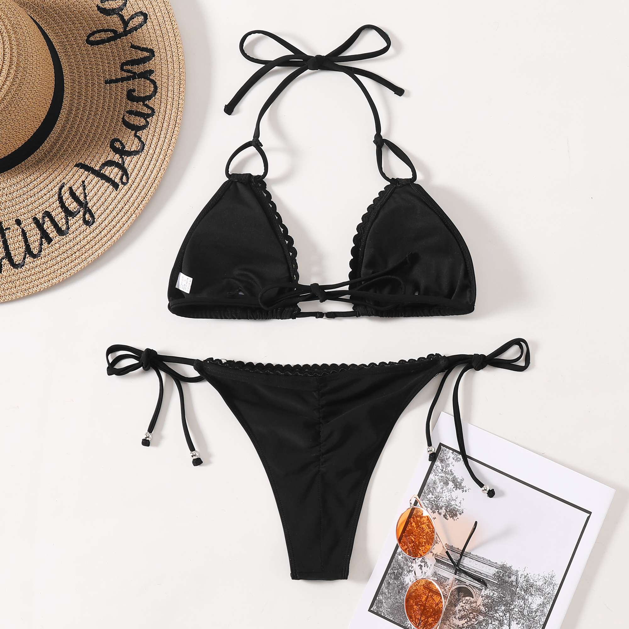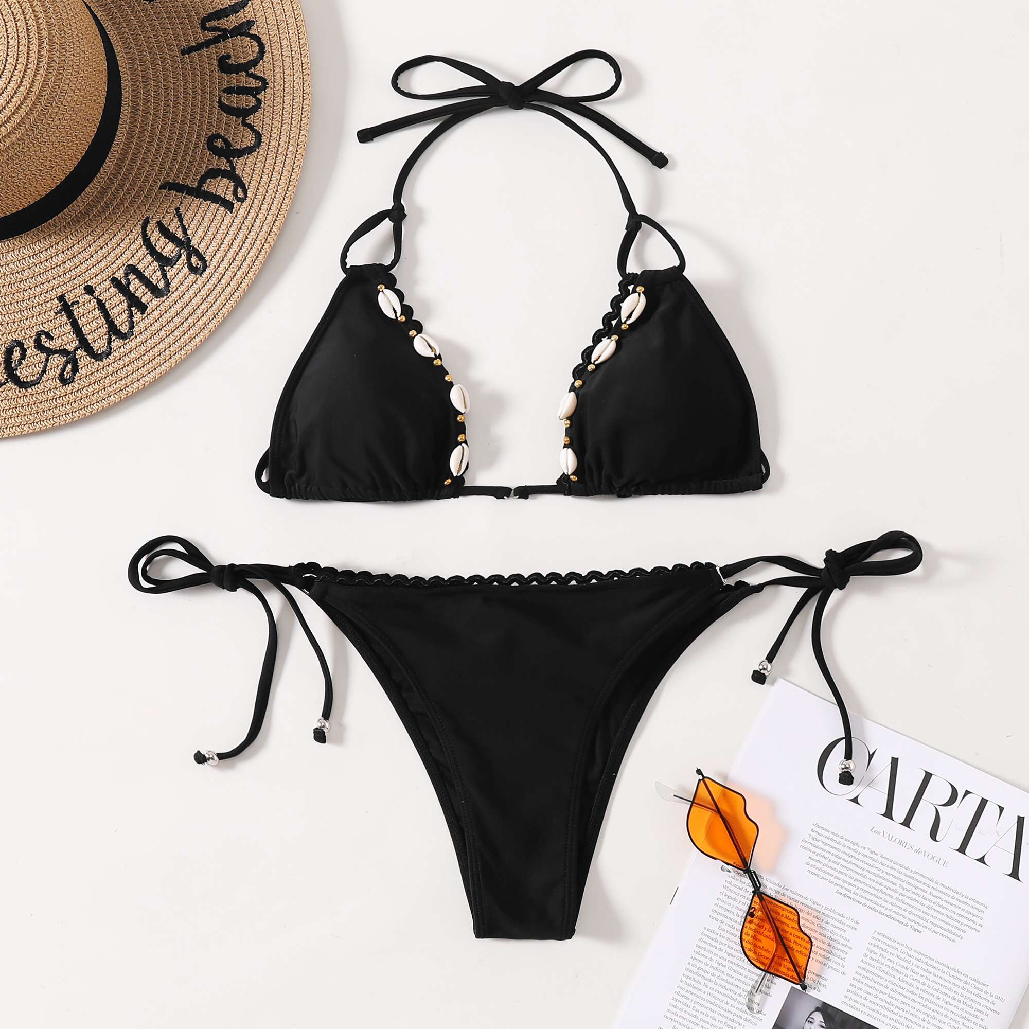 Multiway Halter-Neck Bandage Beaded Triangles Tie Side Bikini Swimwear