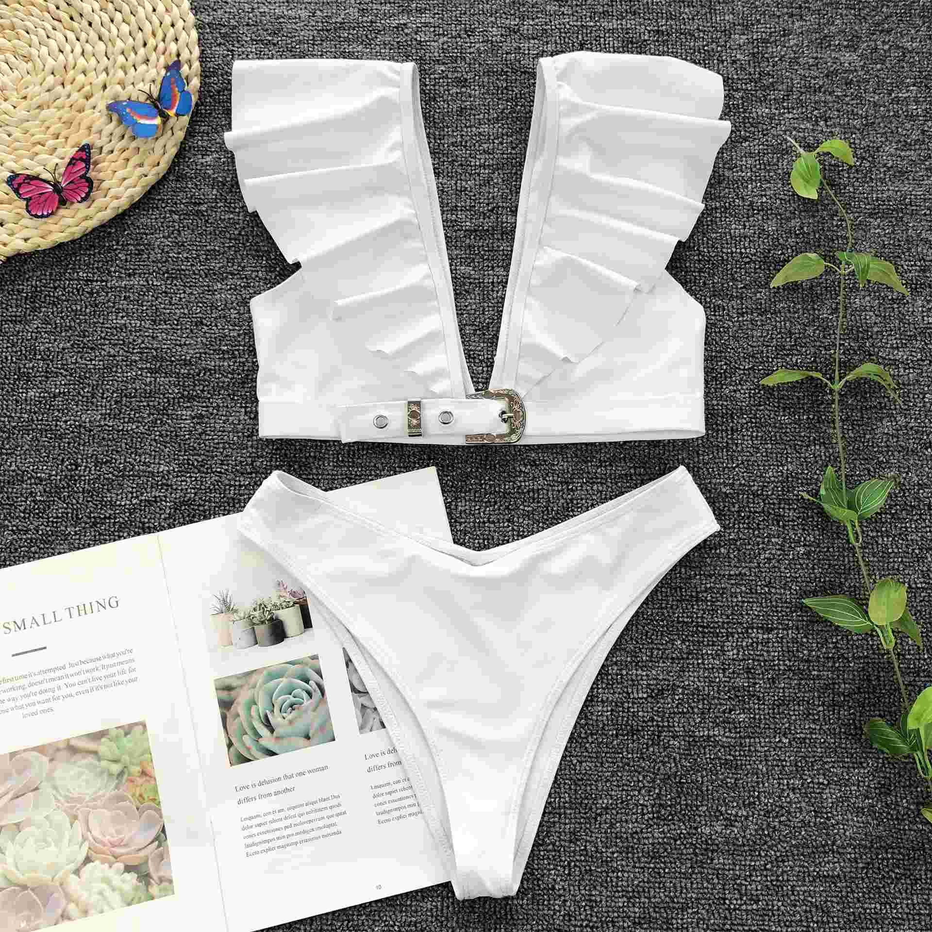 Plain V-Neck Metal Buckle Short Sleeve Bikini Swimwear