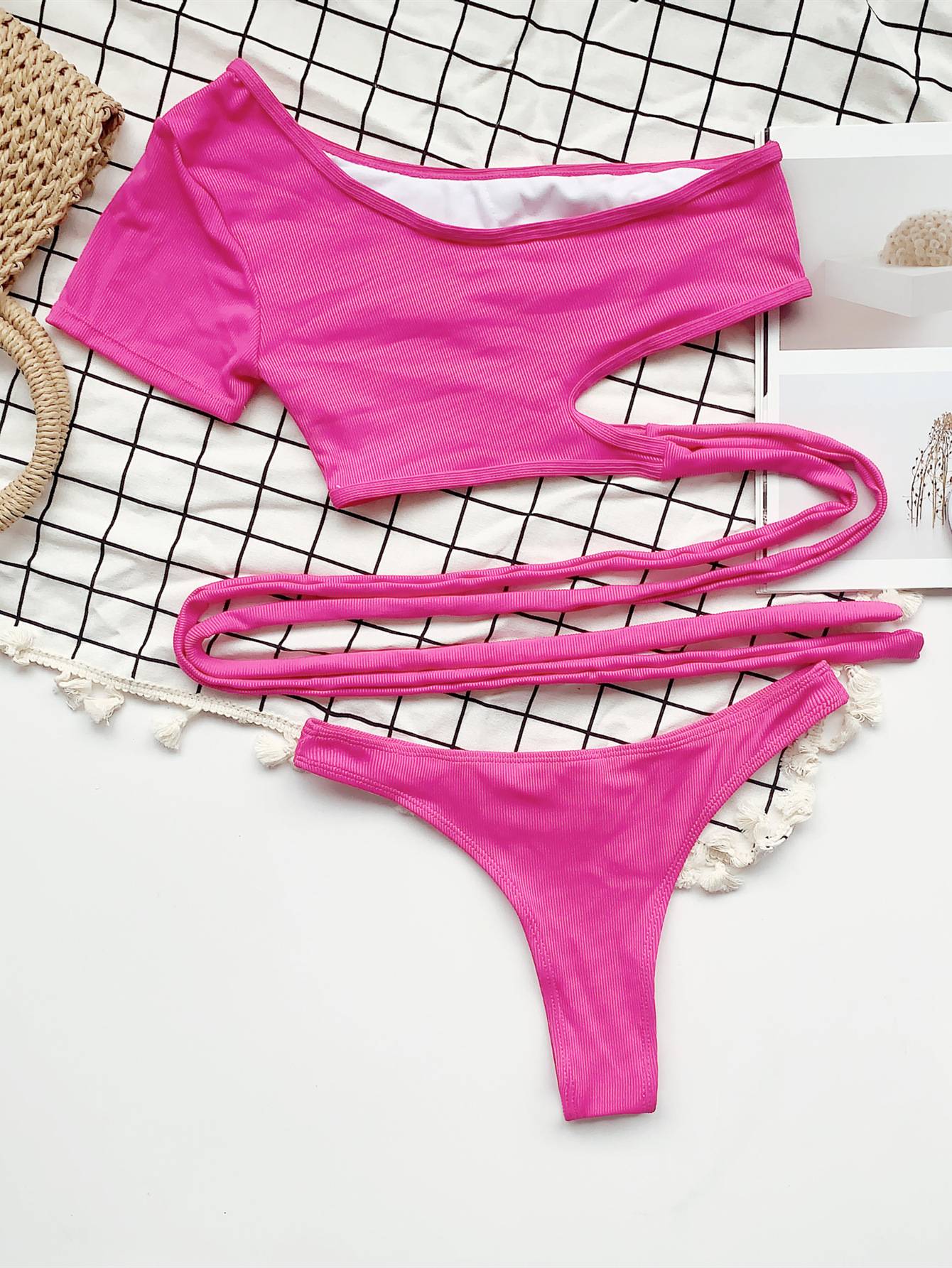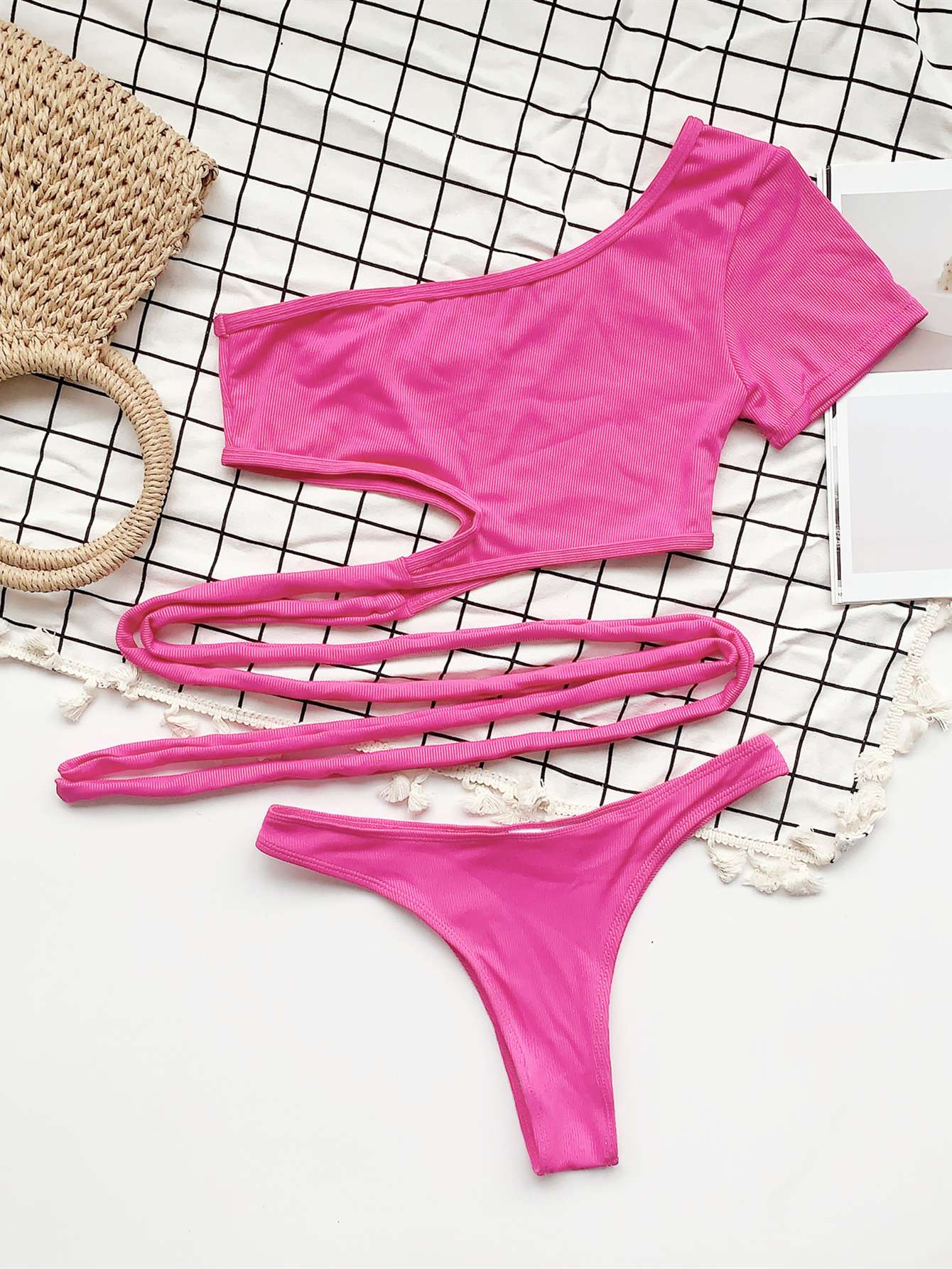 Solid Color Bandage One-Shoulder Split Tankini Swimsuit