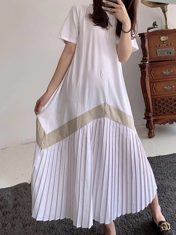 Original Pleated Splicing Loose Short Sleeve Round-Neck White Dress