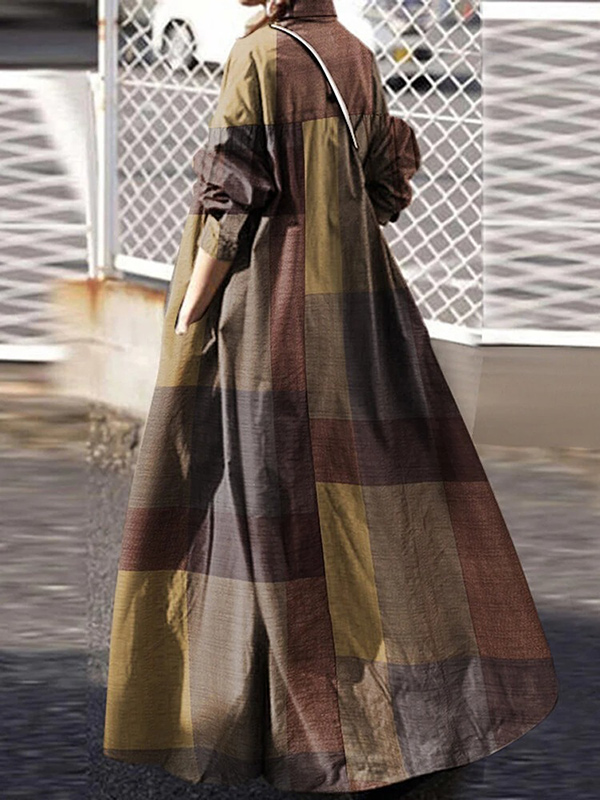 Original Coffee Plaid Loose Long Sleeve Casual Shirt Dress