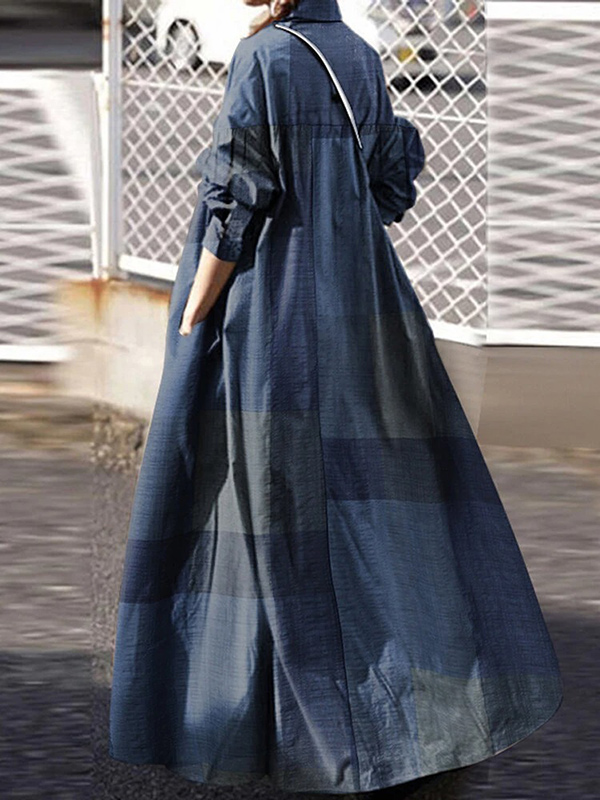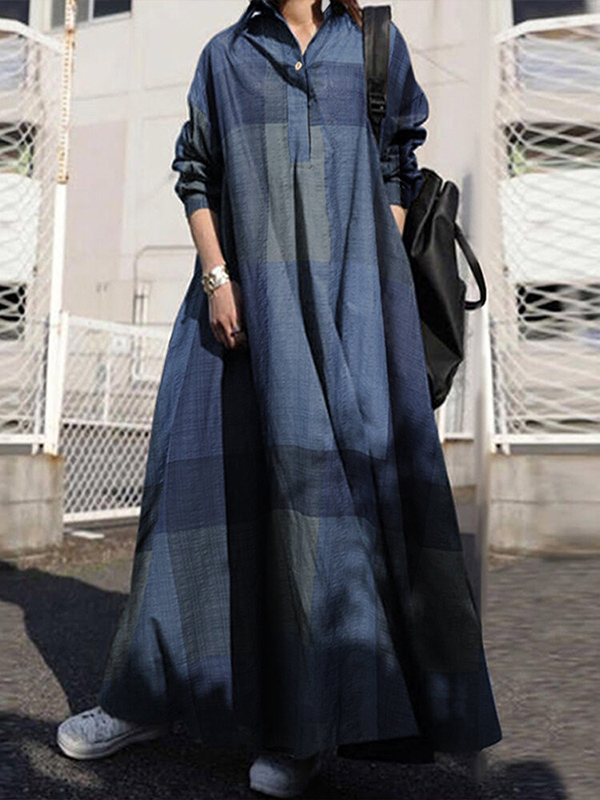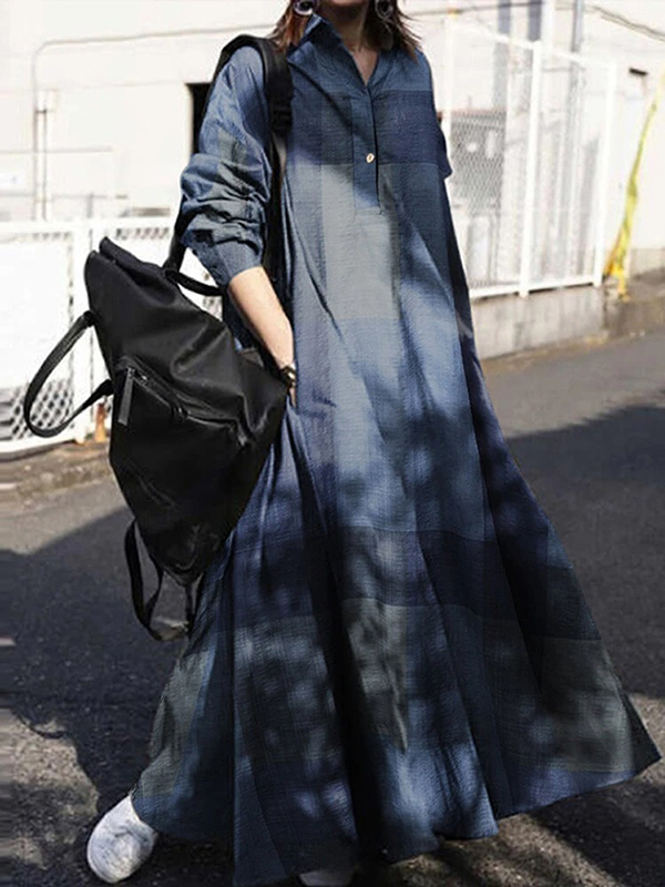 Original Blue Plaid Loose Long Sleeve Casual Shirt Dress